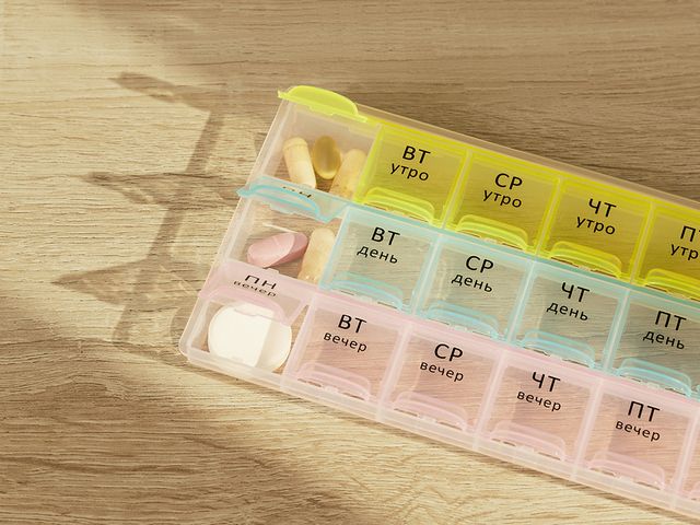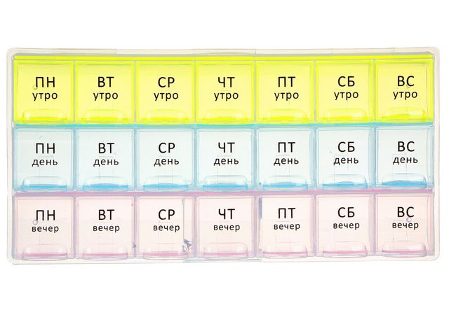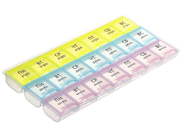 Чтобы не держать лишнюю информацию в голове и не пропустить прием лекарств, витаминов или БАДов, был создан Бокс для таблеток. Пластиковый бокс имеет 21 отсек с маркировкой по дням недели и времени суток – утро, день и вечер. В каждый отсек поместится несколько таблеток или капсул. Заготовьте препараты заранее и вам не придется вспоминать, приняли ли вы лекарство в нужное время.