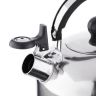 Чайник объемом 1,5 л изготовлен из нержавеющей стали, оснащен несъемным свистком и бакелитовой ручкой, с капсульным дном, подходит использования на всех типах плит, включая индукцию.