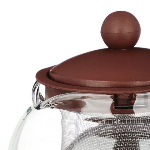 Модель объёмом 500 мл изготовлена из термостойкого стекла и ударопрочного полипропилена, что обеспечивает сохранение тепла и аромата. Съемный фильтр-колба из нержавеющей стали позволяет удобно засыпать чайные листья и легко очищать устройство после использования. Ручка из термостойкого материала не нагревается, обеспечивая безопасность и комфорт при наливании. Универсальный дизайн подходит для приготовления классического чая, травяных настоев и фруктовых смесей. Чайник легко моется и устойчив к образованию пятен.
