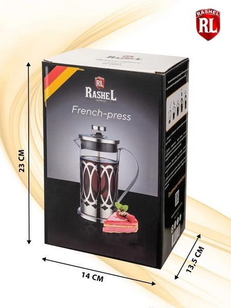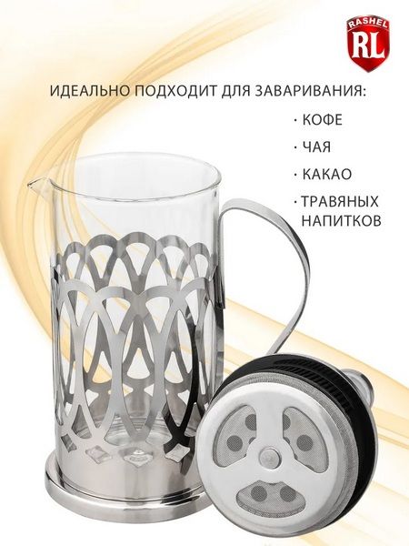 RasheL Кофейник (френч-пресс) 1000мл. Изготовлен из высококачественного термостойкого стекла и нержавеющей стали. Преимущества термостойкого стекла в том, что чайник из него получается легким, термостойким, не впитывает запахов, а также не тускнеет даже по прошествии времени.