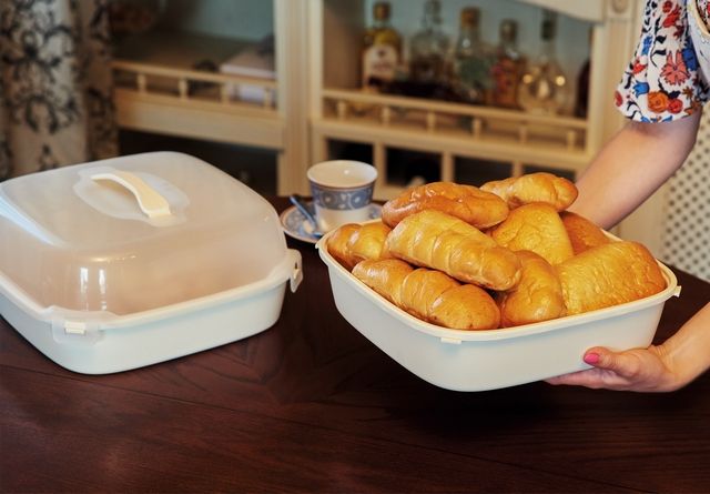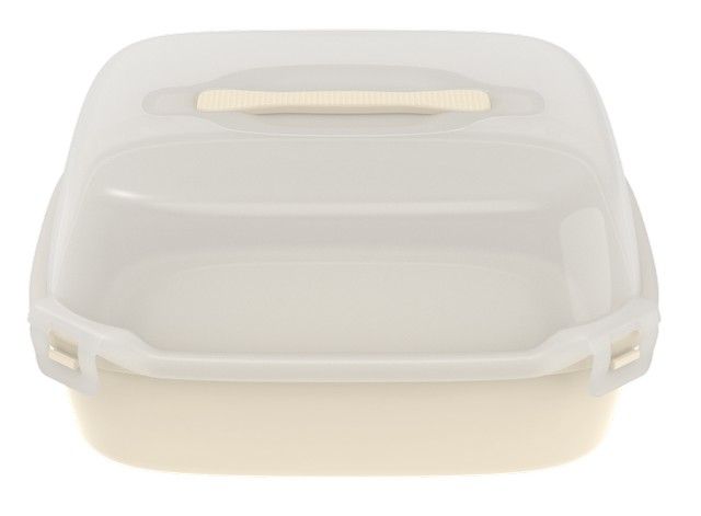 Контейнер подходит для хранения тортов, пирожков, блинов и другой выпечки. Контейнер удобно носить с собой. Защёлки надёжно фиксируют крышку на контейнере.