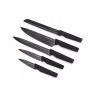 Материал лезвия: нержавеющая сталь с полимерным покрытием. Заточка лезвия: односторонняя. Комплектация: нож поварской, лезвие 20 см; нож для хлеба, лезвие 20,5 см; нож разделочный, лезвие 20,5 см; нож универсальный, лезвие 12,5 см; нож для овощей, лезвие 9 см; подставка для ножей. Тип подставки: настольная с полипропиленовым наполнителем. Материал подставки: пластик. Цвет: черный со вставкой под дерево. Размеры подставки: 9,5х9,5х22 см. Подходит для мытья в посудомоечной машине. Упаковка: цветная картонная коробка.