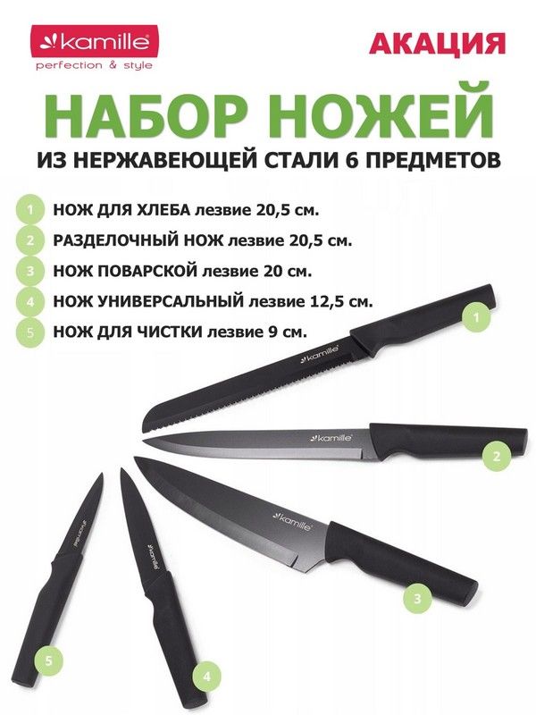 Читать все статьиНабор ножей 6 предметов с подставкой Kamile