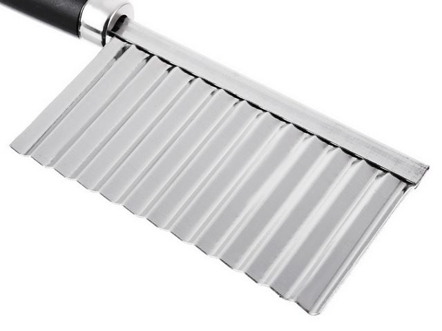 Нож имеет характерное лезвие с выпуклыми зубцами по всему прямому полотну. При нарезании продуктов он придает поверхности ломтиков красивую волнистую форму. Такими ножами удобно резать торты, сыры и ветчину.
