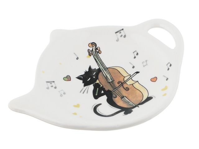 Подставка украшена изображением черного кота, который увлеченно играет на музыкальном инструменте, создавая атмосферу уюта и хорошего настроения. Размеры подставки 12х9х1,5 см идеально подходят для размещения чайного пакетика. Изделие из высококачественной керамики имеет повышенную прочность и устойчивость к образованию царапин и сколов.