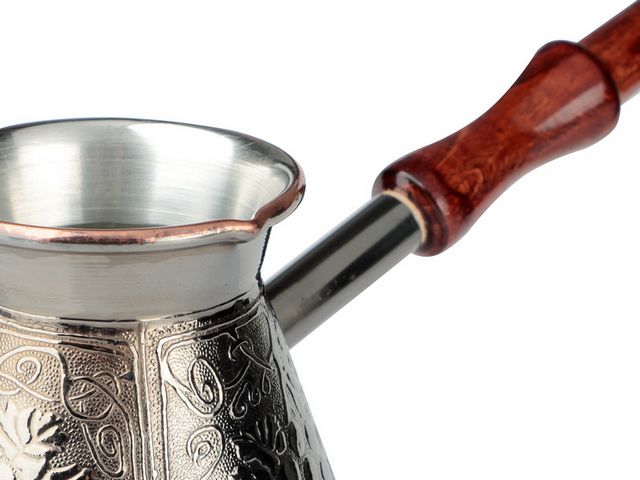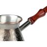 Медная турка для кофе объемом 540мл хорошо проводит тепло и обеспечивает быстрое приготовление классического напитка. Материал не боится ржавчины и механических повреждений. Корпус турки декорирован изящными орнаментами. Добротная ручка выполнена из натурального дерева. Металлическое кольцо позволяет хранить посуду в подвешенном положении.