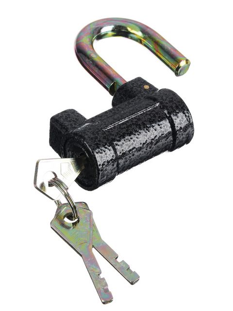 Сложная конструкция замка повышает стойкость к взлому, а стальная дужка снижает вероятность её распила.